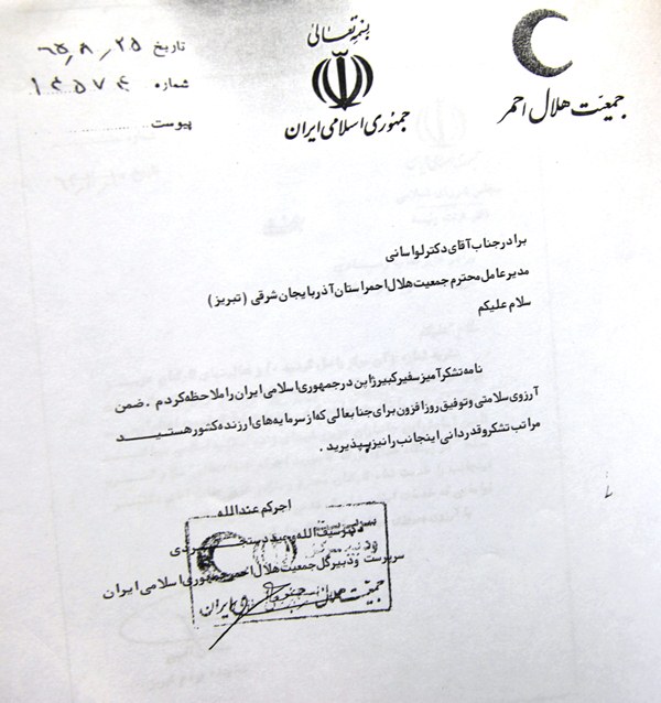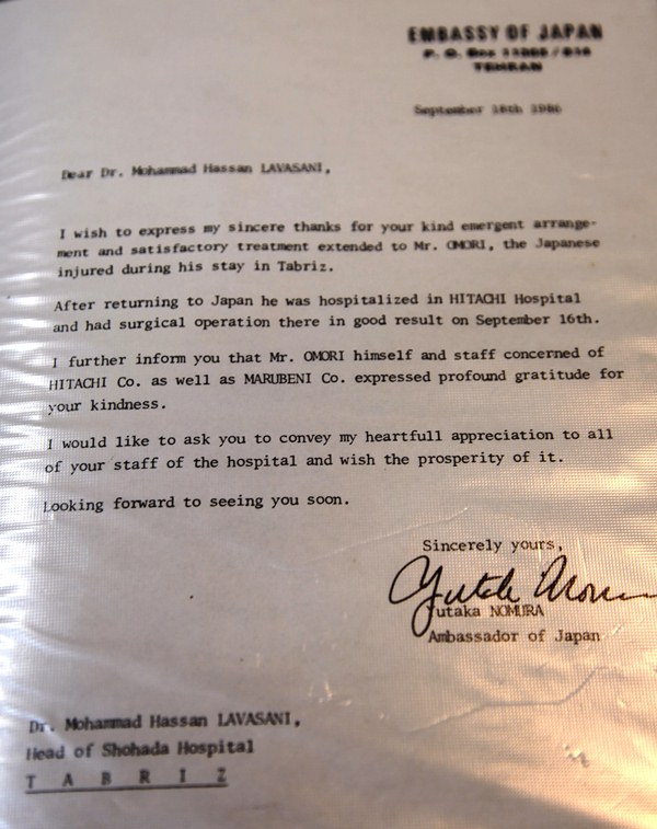 در بحبوه جنگ در اثر بمباران نیروگاه تبریز تعدادی از مهندسین ژاپنی که در نیروگاه تبریز کار می کردند مجروح شده بودند که  در بیمارستان شهدای تبریز تحت عمل جراحی قرار دادیم  وبعدا این مجروحین به بیمارستان هیتاجی ژاپن انتقال یافته بودند و در آنجا جراحان ژاپنی بالاتفاق عمل جراحی پزشکان مارا تحسین کرده بودند که سفیرژاپن طی نامه ای مراتب تقدیر و تشکر دولت و ملت ژاپن را از این اقدام هلال احمر اعلام داشته بودند.