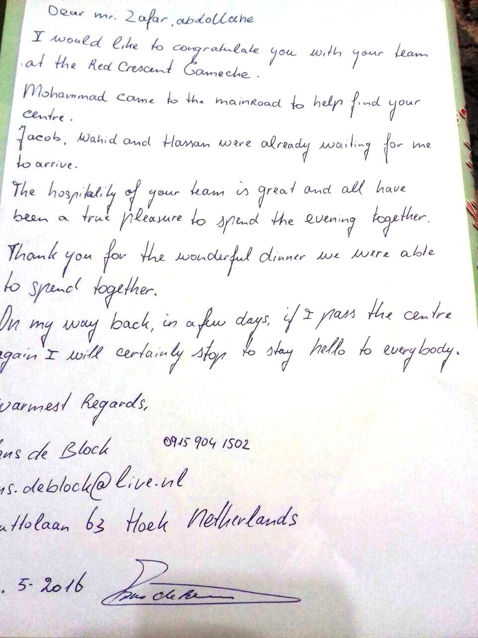 دوچرخه سوار هلندی در یادداشت خود بر دفتر یادمان پایگاه با تجلیل از زحمات و تلاشهای نجاتگران آورده است: مهمان نوازی تیم شما خیلی خوب و برایم  لذتبخش بود  و بخاطر مهمانوازی خوب  ، از شما تشکر می کنم.