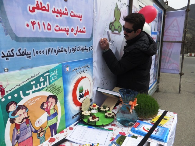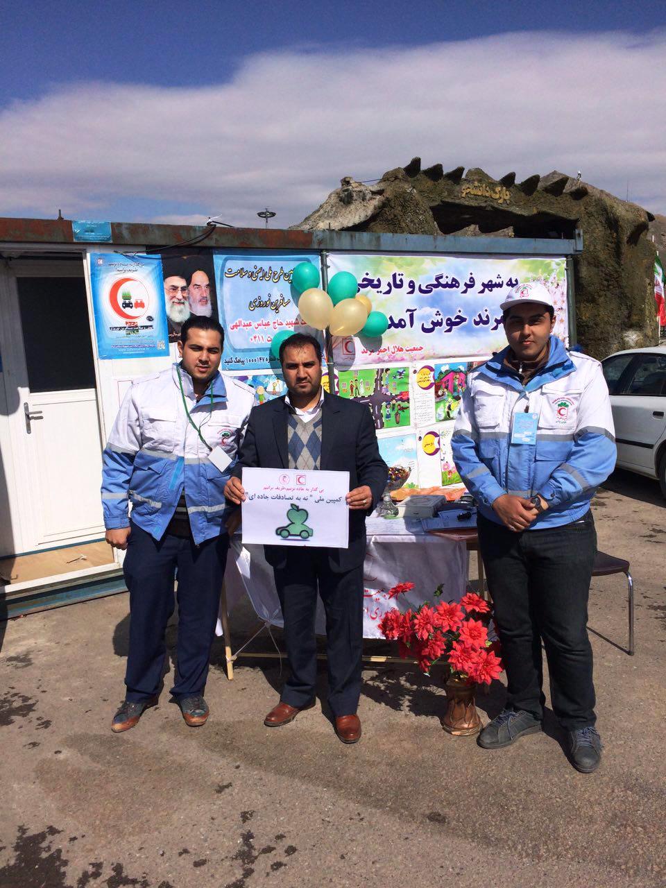 سرپرست جمعیت هلال احمر مرند ادامه داد :معاون استاندار و فرماندار ویژه شهرستان مرند به همراه دبیر بحران شهرستان با حضور در کانکس راهنمای نوروزی مرند به کمپین "نه به تصادفات جاده ای" پیوستند.