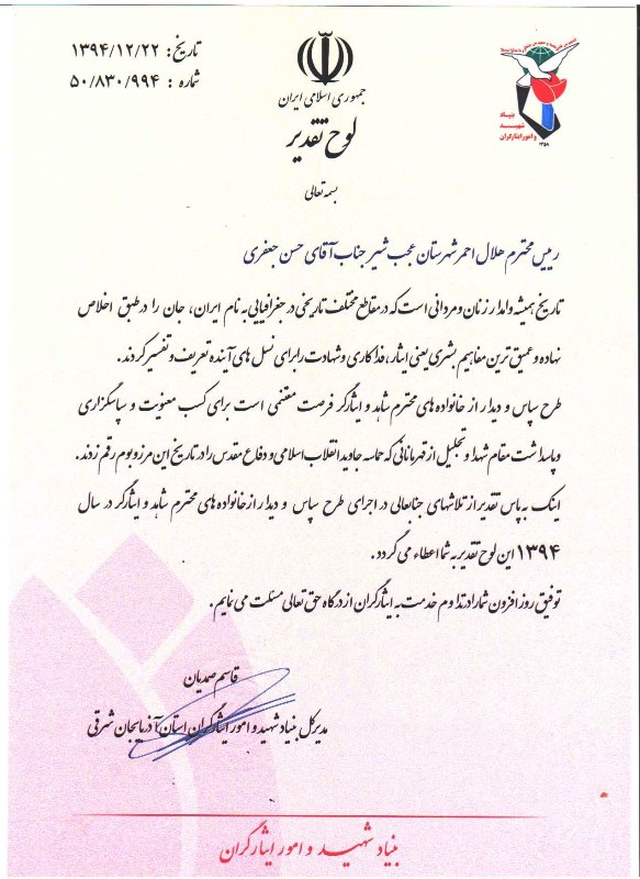مدیرکل بنیادشهید وامورایثارگران استان با ارسال لوحی ازعملکرد جمعیت هلال احمر عجب شیر در راستای عیادت از خانواده های معظم شهدا تجلیل نمودند.