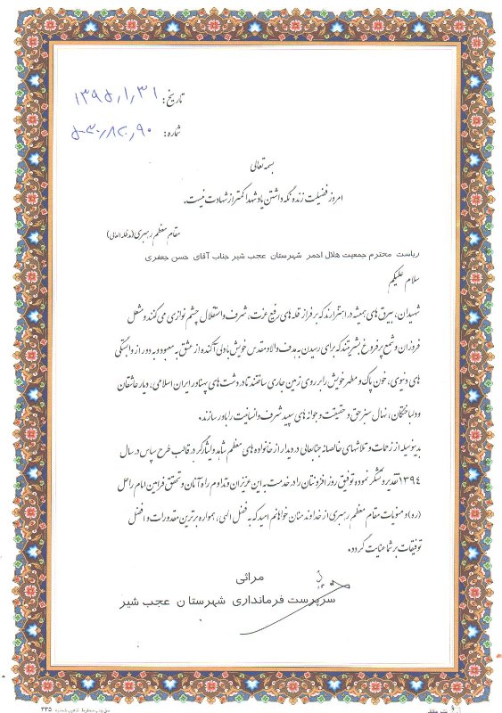 مراثی فرماندارعجب شیرازفعالیت های هلال احمر درسال 94 تقدیر یعمل آوردند به گزارش روابط عمومی جمعیت هلال احمر استان آذربایجانشرقی مراثی سرپرست فرماندارعجب شیر ازفعالیتهای سال 94 جمعت هلال احمر این شهرستان بخصوص دردیدارازخانواده محترم شهداوایثارگران درقالب طرح سپاس وجضور درمزار شهداویادمان شهدای گمنام وتجدید میثاق باآرمانهای والای این عزیزان بالوح تقدیرتجلیل بعمل آوردند