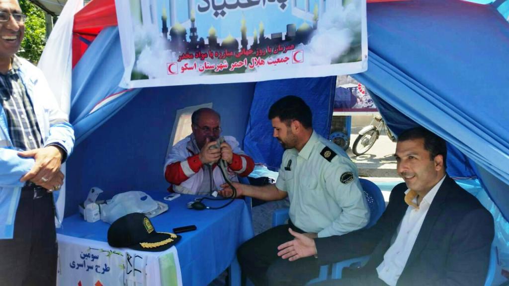 این گزارش می افزاید : در این چادرها جوانان جمعیت هلال احمر اسکو اقدام به توزیع جزوات و بروشور ها و مجلات آموزشی نه به اعتیاد در بین شهروندان نمودند .