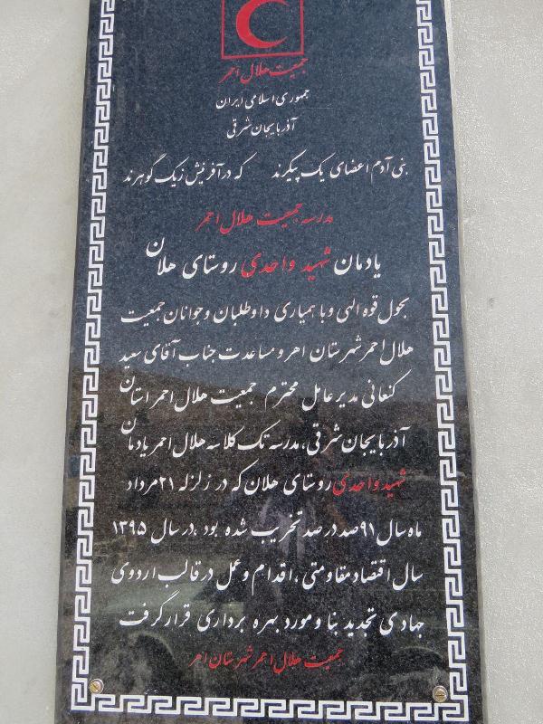 به گزارش روابط عمومی جمعیت هلال احمر استان آذربایجان شرقی ، این واحد آموزشی روستای هلان که در اثر زلزله سال ۹۱ ارسباران تخریب شده بود، بدون اینکه اعتبارات دولتی اختصاص یابد ، با کمک خیران و با همت اعضای سازمان جوانان جمعیت هلال احمر شهرستان اهر، در ۲۵ روز احداث و در اختیار دانش آموزان روستای هلان قرار گرفت.