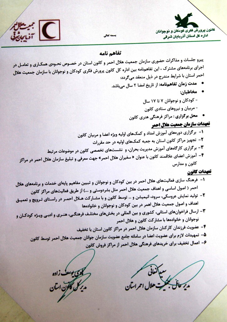 انعقاد تفاهم نامه همکاری بین هلال احمر و کانون پرورش فکری کودکان و نوجوانان استان  آذربایجان شرقی