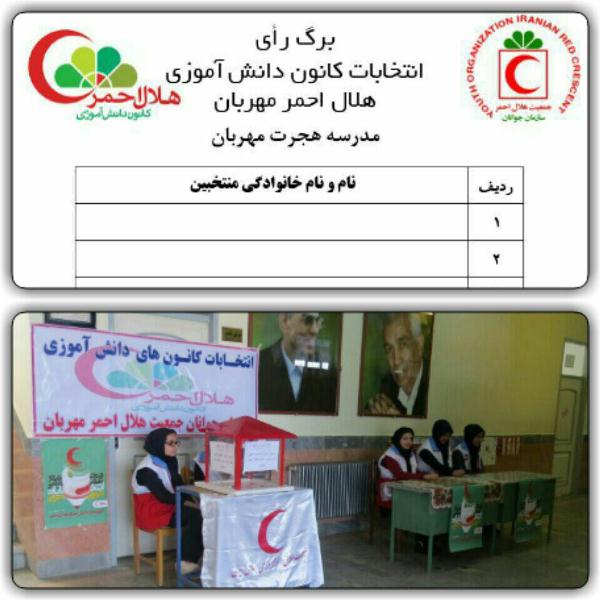 این گزارش می افزاید ؛انتخابات کانون دانش اموزی هجرت مهربان باحضور 130نفر ازاعضای کانون برگزار شدکه پس از برگزاری انتخابات طرح آموزشی دادرس(دانش آموز آماده در روزهای سخت) به عنوان اولین برنامه آموزشی در کنار فعالیت های بشر دوستانه بین اعضا کانون های دانش آموزی هلال احمر انجام خواهد شد.