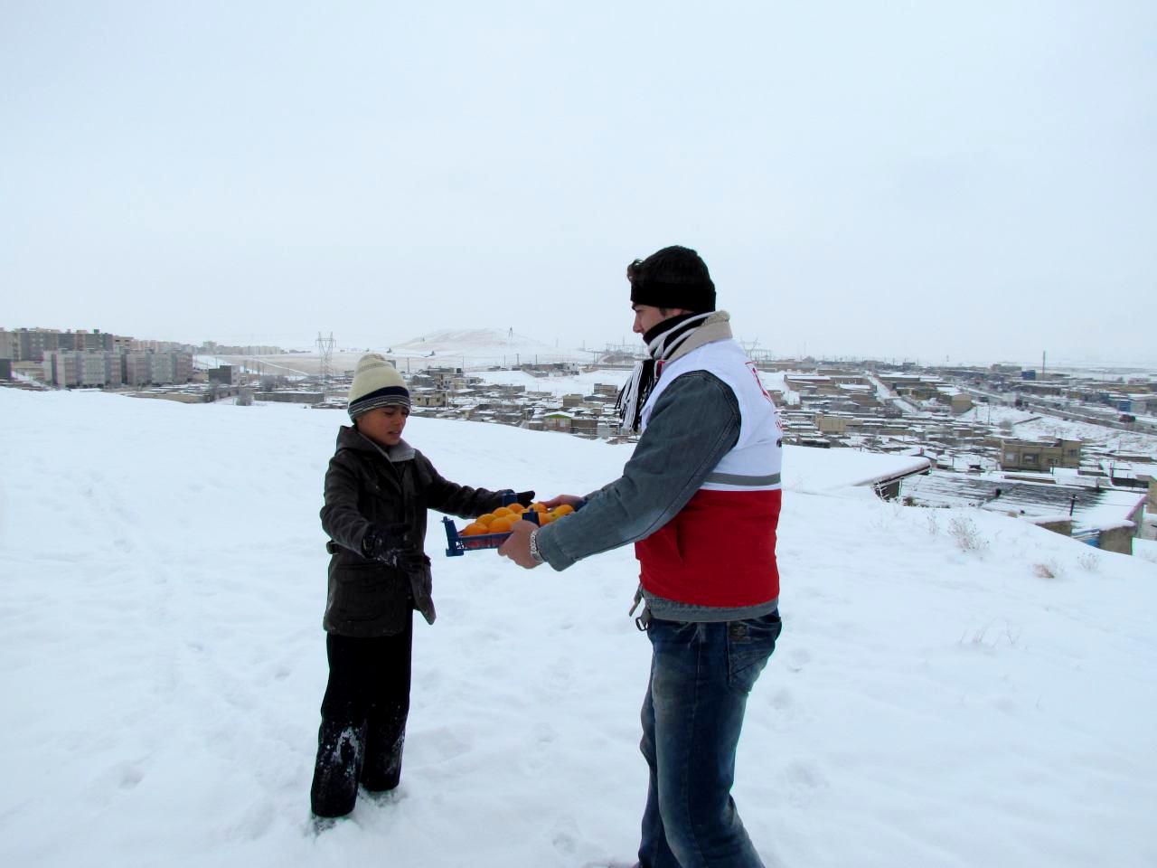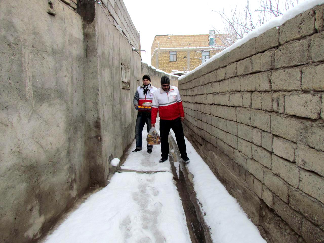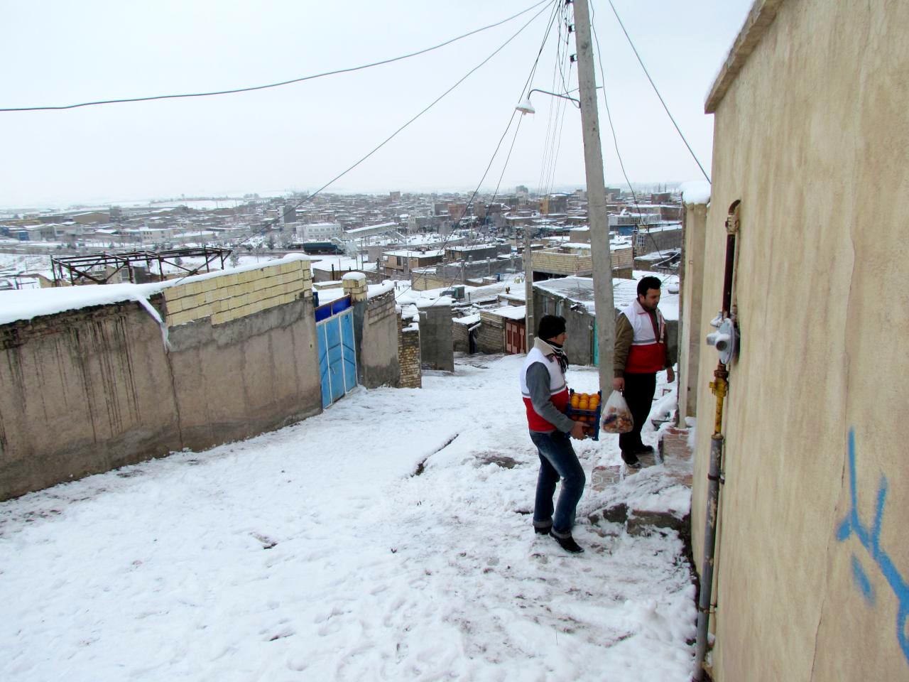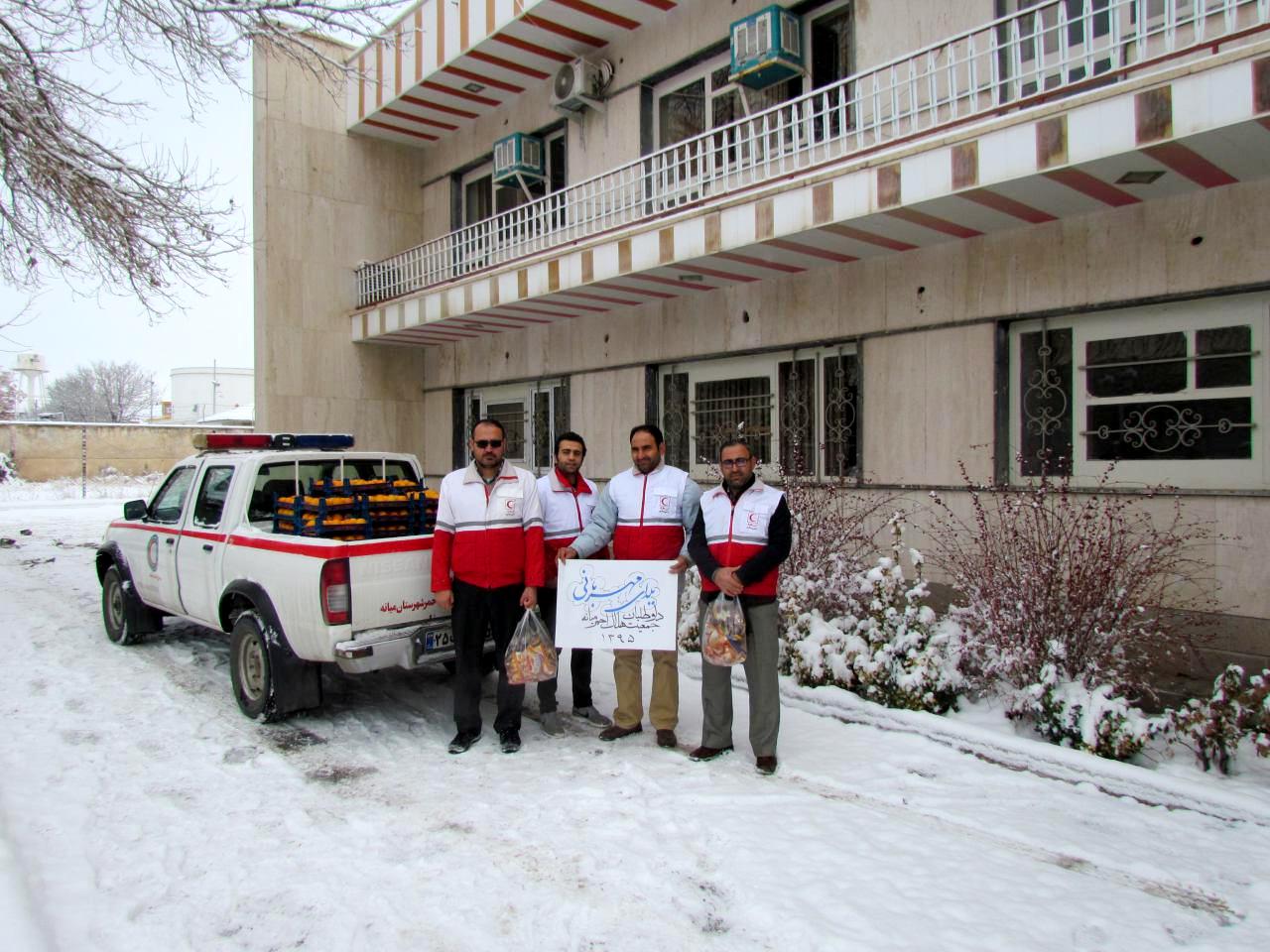 داوطلبان جمعیت هلال احمرشهرستان میانه در آستانه شب یلدا به تعدادی  از خانواده های محروم حاشیه شهر بسته های یلدایی اهدا کردند