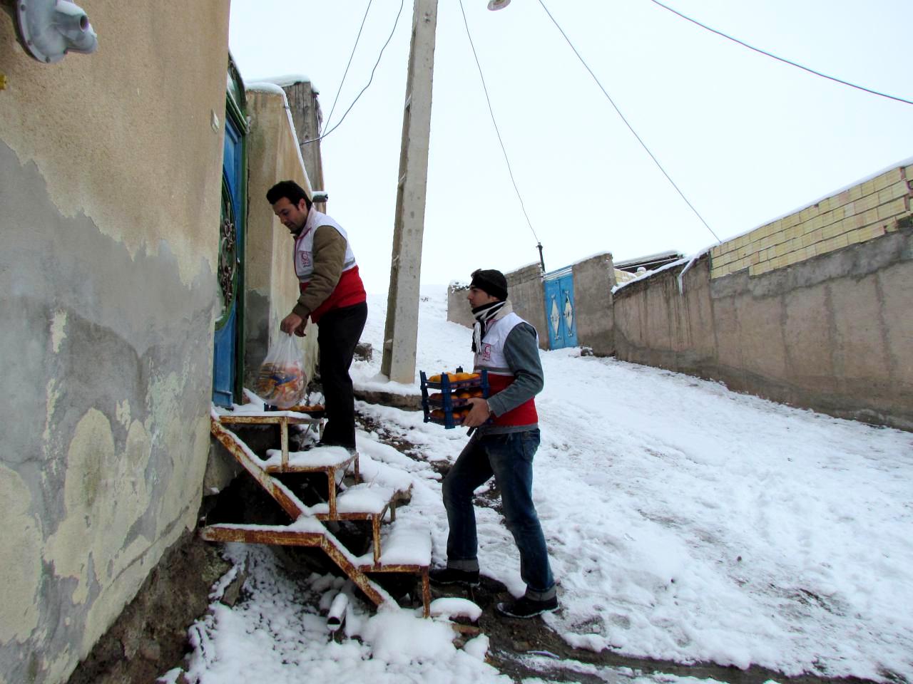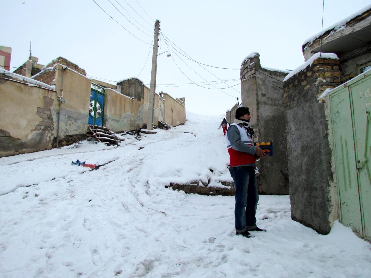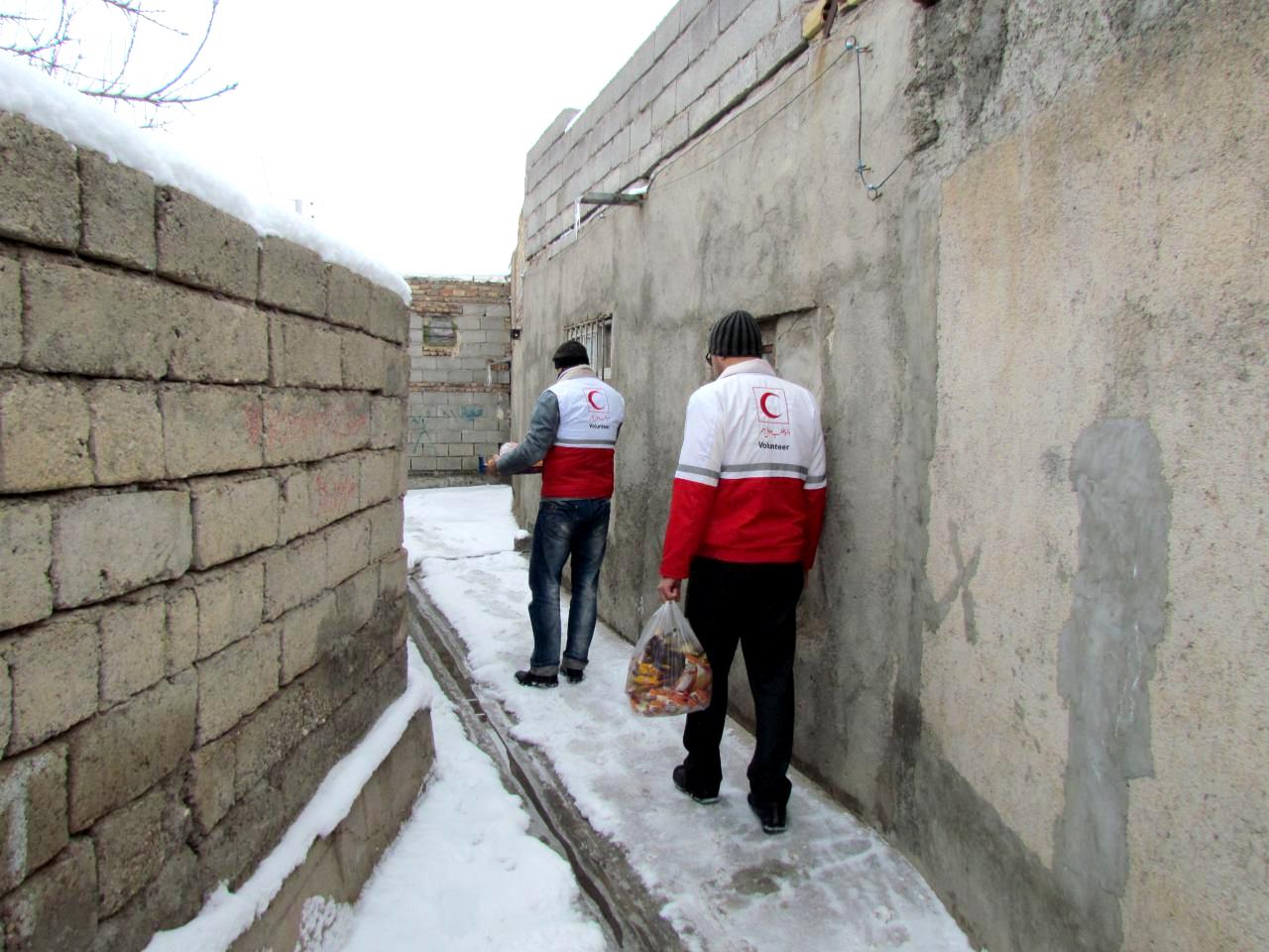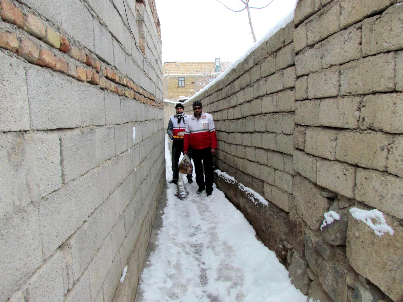 داوطلبان جمعیت هلال احمرشهرستان میانه در آستانه شب یلدا به تعدادی  از خانواده های محروم حاشیه شهر بسته های یلدایی اهدا کردند