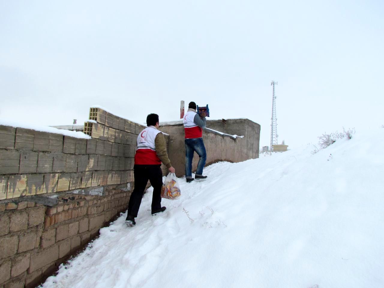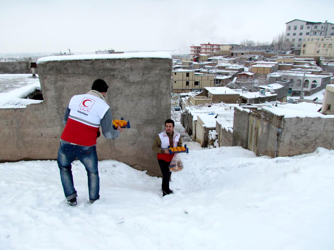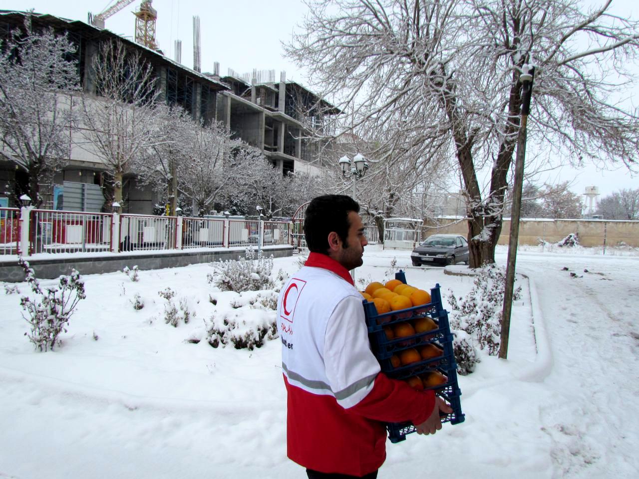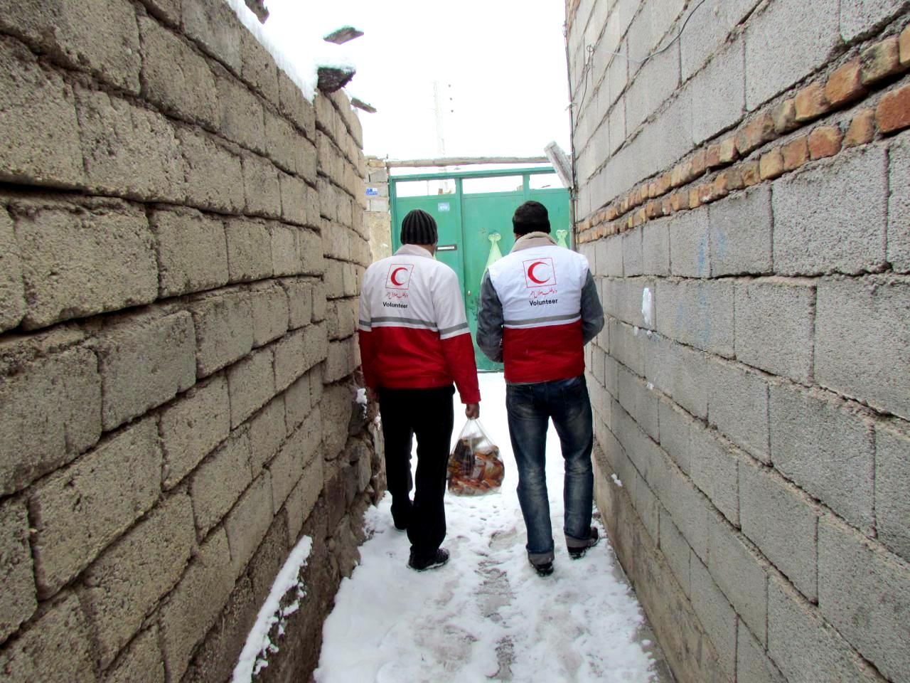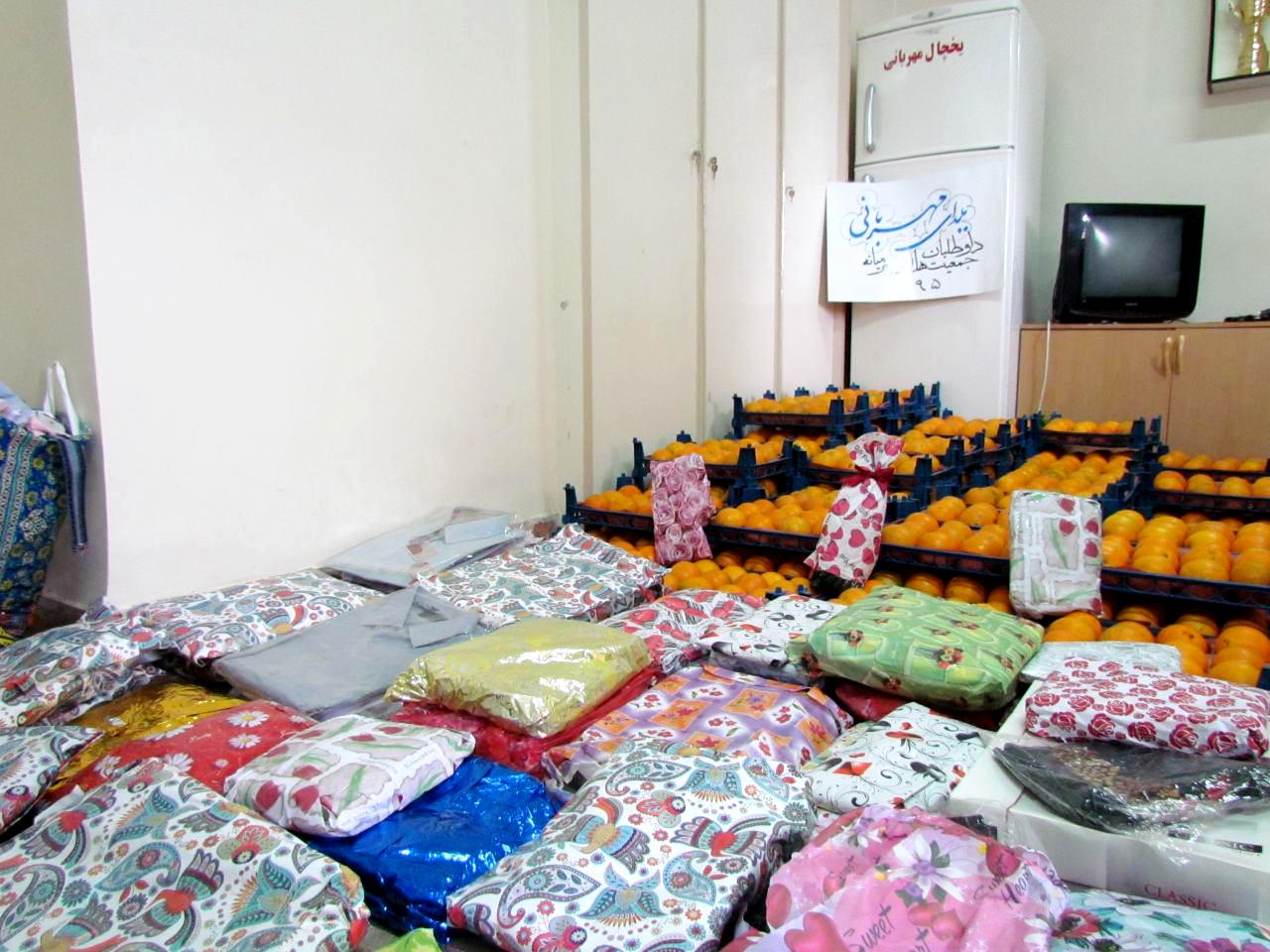 داوطلبان جمعیت هلال احمرشهرستان میانه در آستانه شب یلدا به تعدادی  از خانواده های محروم حاشیه شهر بسته های یلدایی اهدا کردند