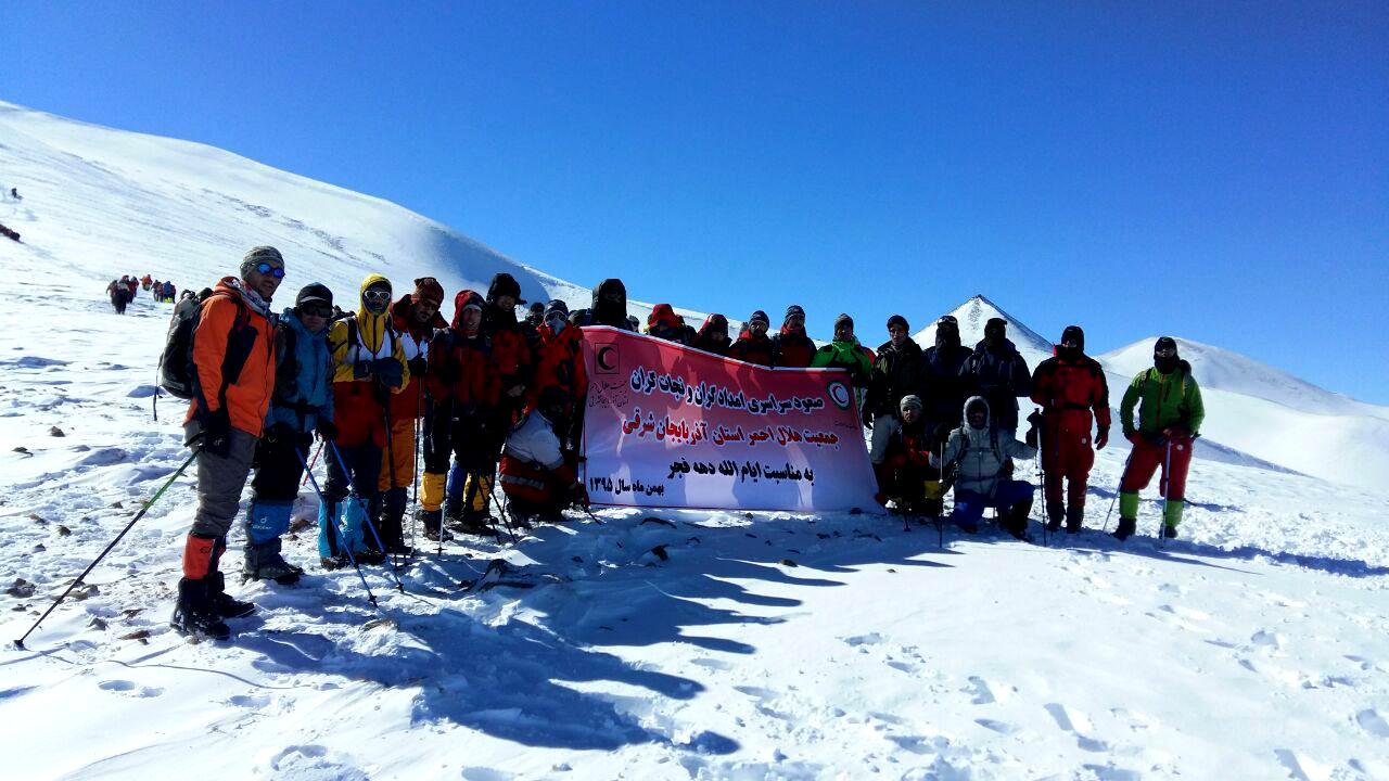 به گزارش روابط عمومی جمعیت هلال احمر استان آذربایجان شرقی ؛ به منظور بالابردن آمادگی وتوان جسمانی نیروها و همچنین پشتیبانی صعود کنندگان هیئتکوهنوردی استان، روز جمعه 15بهمن ، امدادگران و نجاتگران جمعیت هلال احمراستان آذربایجان شرقی به قله ۳۷۰۷ متر ی کمال(قوچ گولی) بلندترین قلهکوهستا ن سهند صعود و پرچم سه رنگ جمهوری اسلامی ایران و پرچم سرخ و سفید جمعیتهلال احمر را برفراز آن به اهتزاز در آوردند .این گزارش می افزاید ؛ در این صعود که بمناسبت دهه مبارک فجر صورت گرفت 70 تن از نجاتگران و امدادگران عضو تیمهای امدادو نجات کوهستان و شعب هلال احمر استان و تیم واکنش سریع استان حضور داشتند