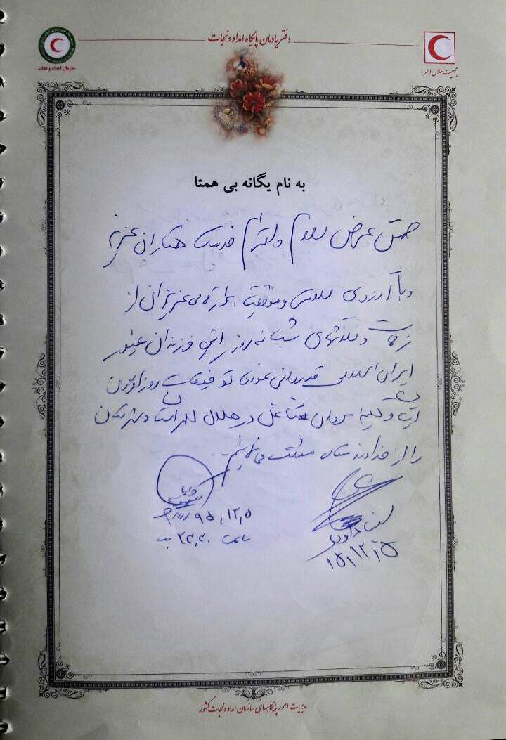 عضو داوطلب هلال احمر در این دیدار با یادداشتی کوتاه در دفتر یادمان پایگاه امداد جاده ای شهید امیر صالحی منطقه تاریخی پلدختر جمعیت هلال احمر شهرستان میانه از زحمات و تلاشهای شبانه روزی و بی وقفه نجاتگران هلال احمر در خدمت به مردم تقدیر کرد.