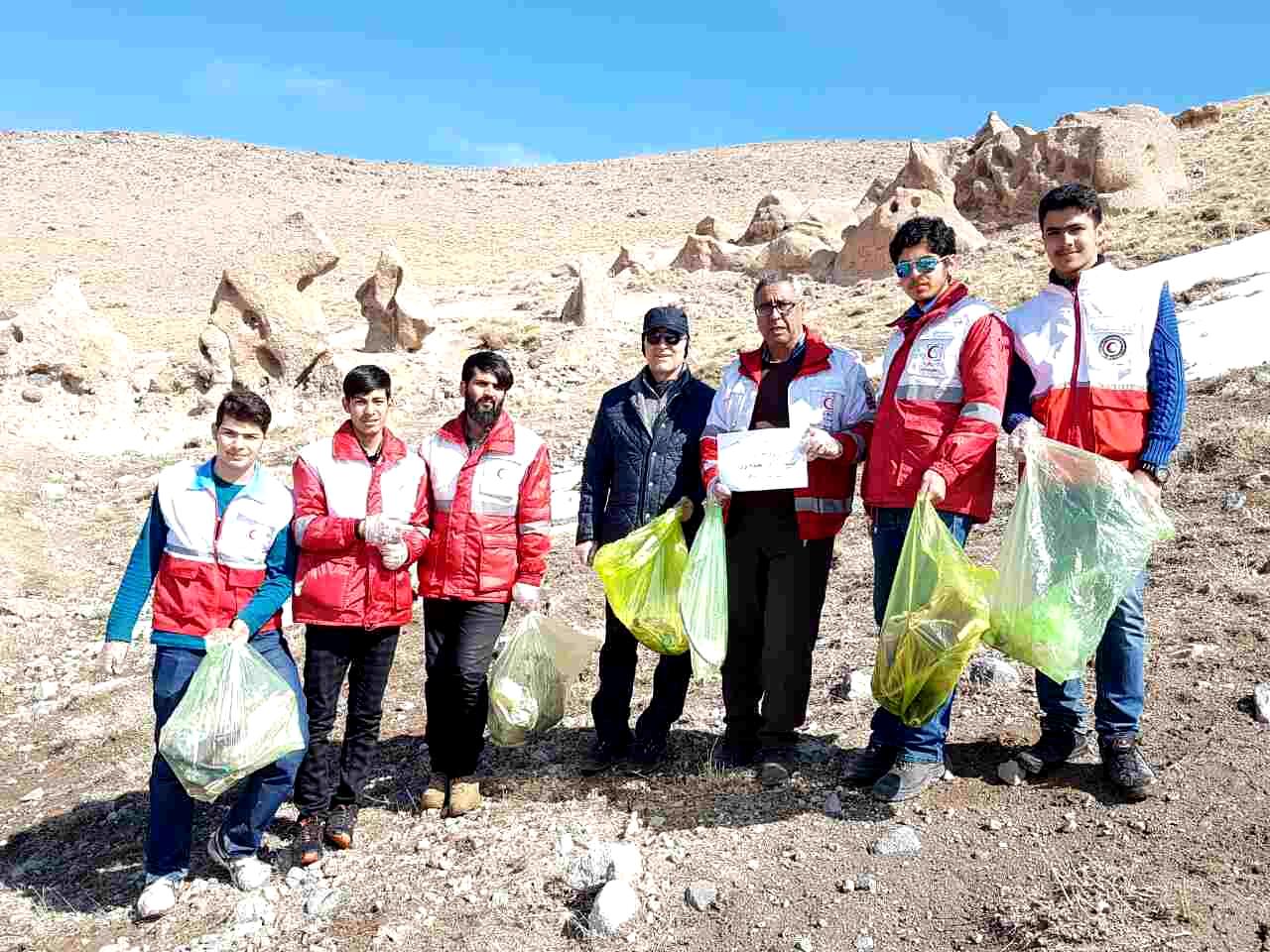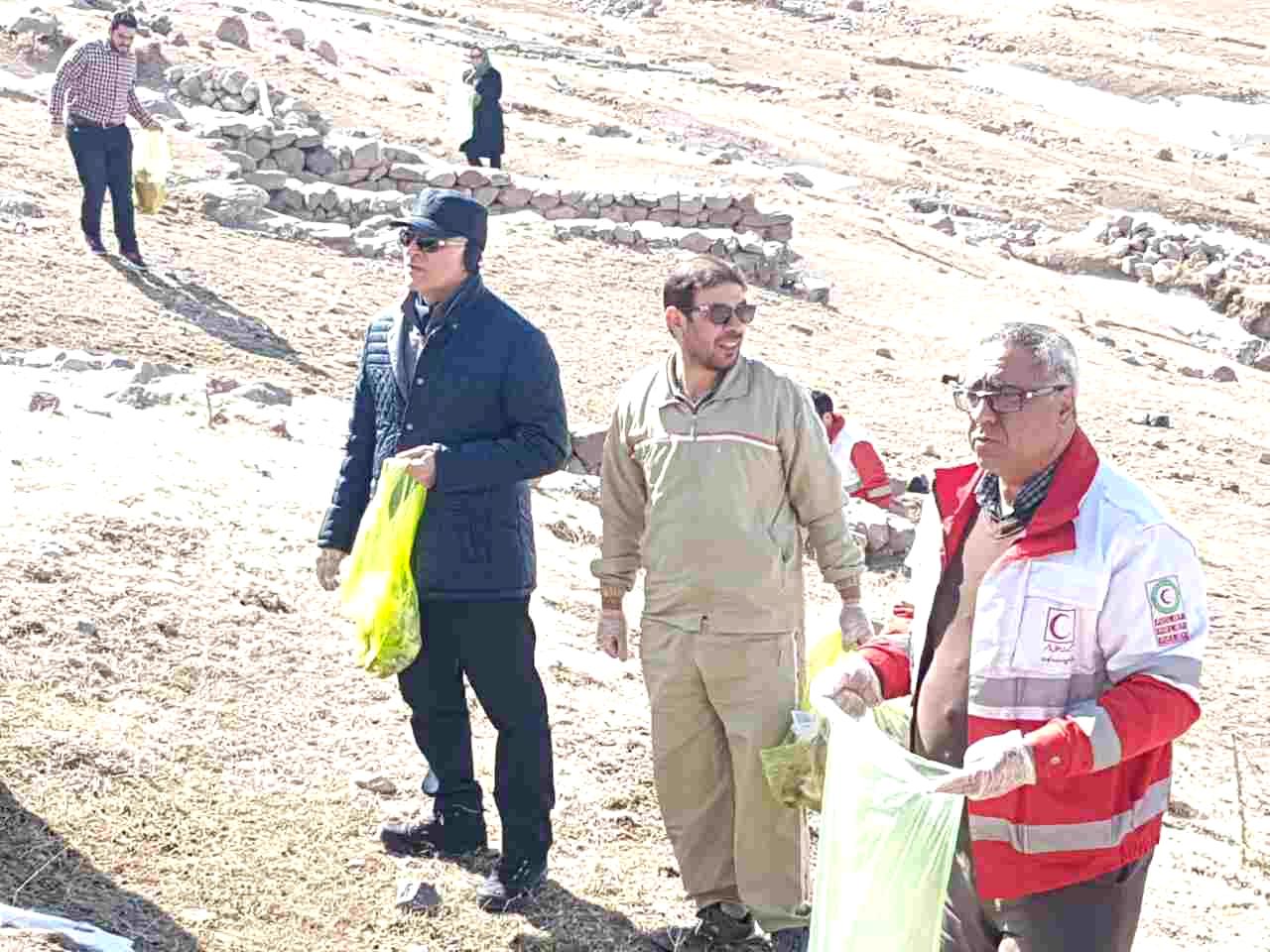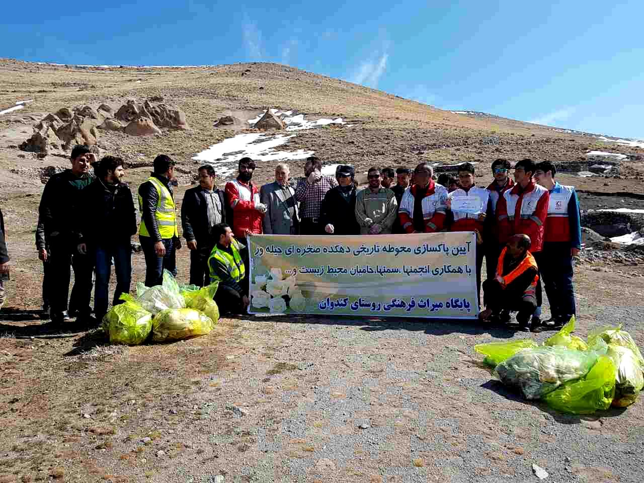 اعضای کانونهای دانشجویی و دانش آموزی هلال احمر اسکو اقدام به پاکسازی محوطه تاریخی روستای صخره ای حیله ور مدفون در خاک شهرستان اسکو از زباله های رها شده نمودند