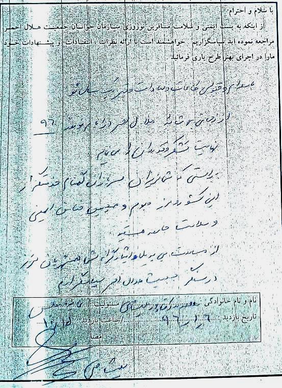 وی در این بازدید با تجلیل از خدمات قابل توجه جمعیت هلال احمر به مسافران در ایام تعطیلات نوروزی  در یادداشتی بر دفتر یاد بود پست جوانان نوشت :از زحمات بی شائبه هلال احمری ها در ایام نوروز 96 نهایت  تشکر و قدردانی را دارم ،براستی  شما عزیزان سربازان گمنام خدمتگزار این مرزو بوم بوده و ضامن ایمنی و سلامت جامعه هستید.از مساعدت بی بدیل و جوانان ایثارگر و همشهریان عزیز در سنگر خدمت جمعیت هلال احمر سپاسگزارم .