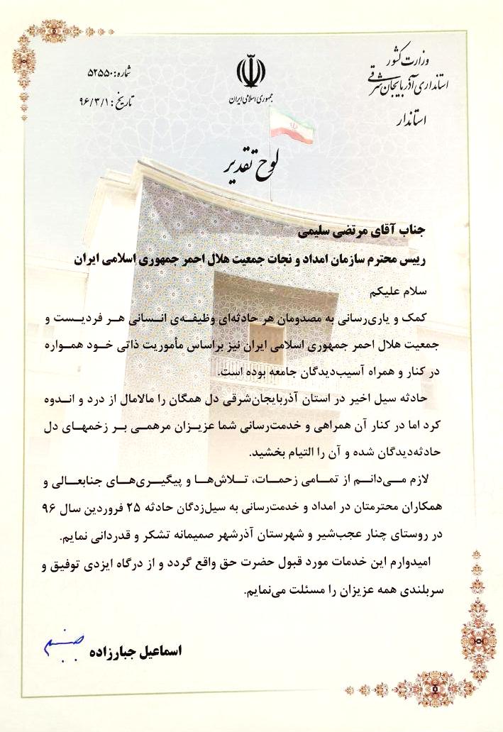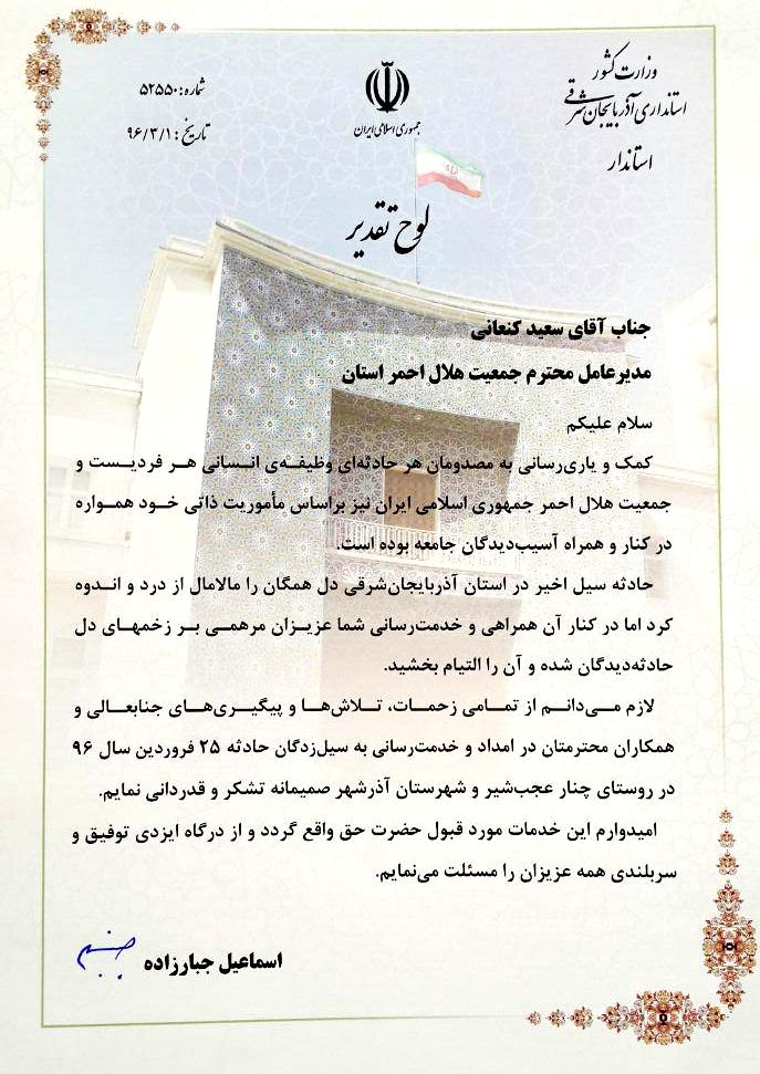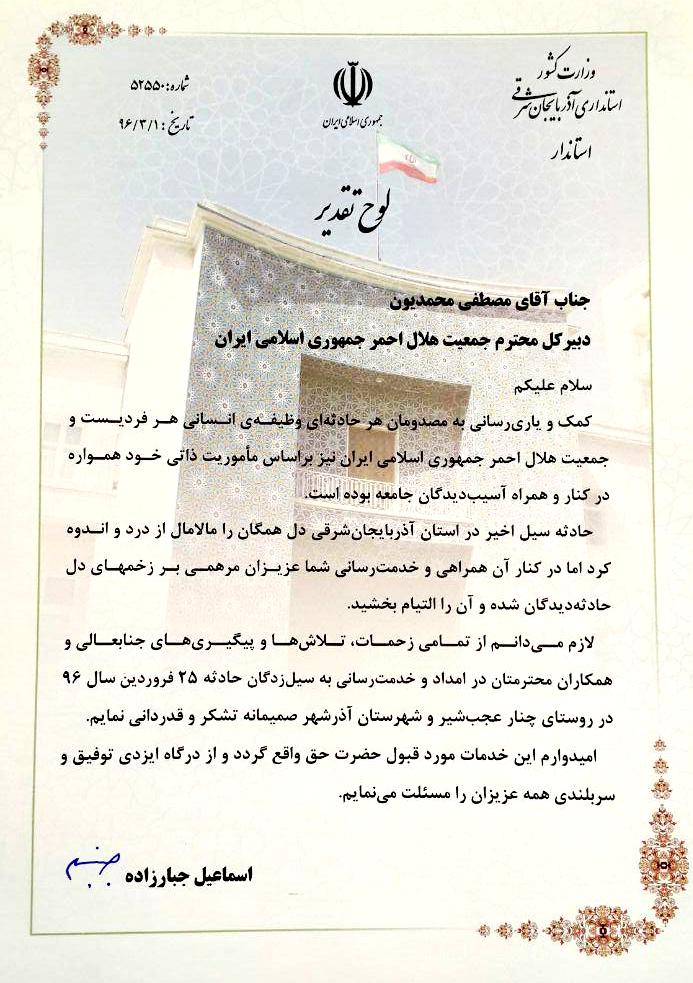 لازم می دانم از تمامی زحمات ،تلاشها و پیگیری های جنابعالی و همکاران محترمتان در امداد و خدمت رسانی به سیل زدگان 25 فروردین سال 96 در روستای چنار عجب شیر و شهرستان آذرشهر صمیمانه تشکر و قدردانی نمایم .