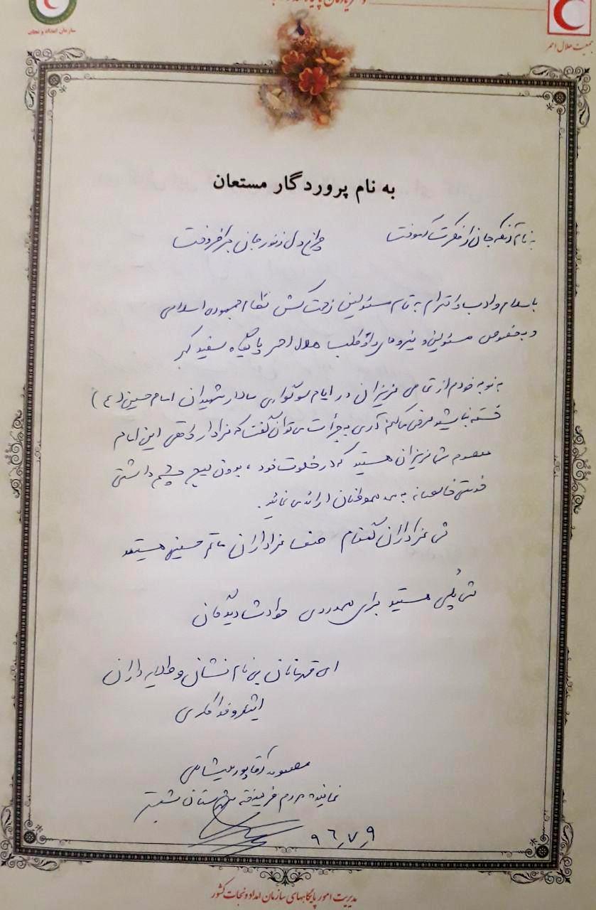 نماینده مردم شبستر در مجلس شورای اسلامی طی یادداشتی در دفتر یادبود این پایگاه با تسلیت ایام سوگواری سالار شهیدان و سرور آزادگان عالم ، عنوان کرد : به تمامی عزیزان و نجاتگران هلال احمر خسته نباشید عرض می کنم به جرات می توان گفت که شما عزیزان از عزاداران واقعی امام حسین هستید که در خلوت خود و بدون هیچ چشم داشتی خدمتی خالصانه به هموطنان ارائه می دهید وشما جز عزاداران گمنام ماتم حسینی هستید .