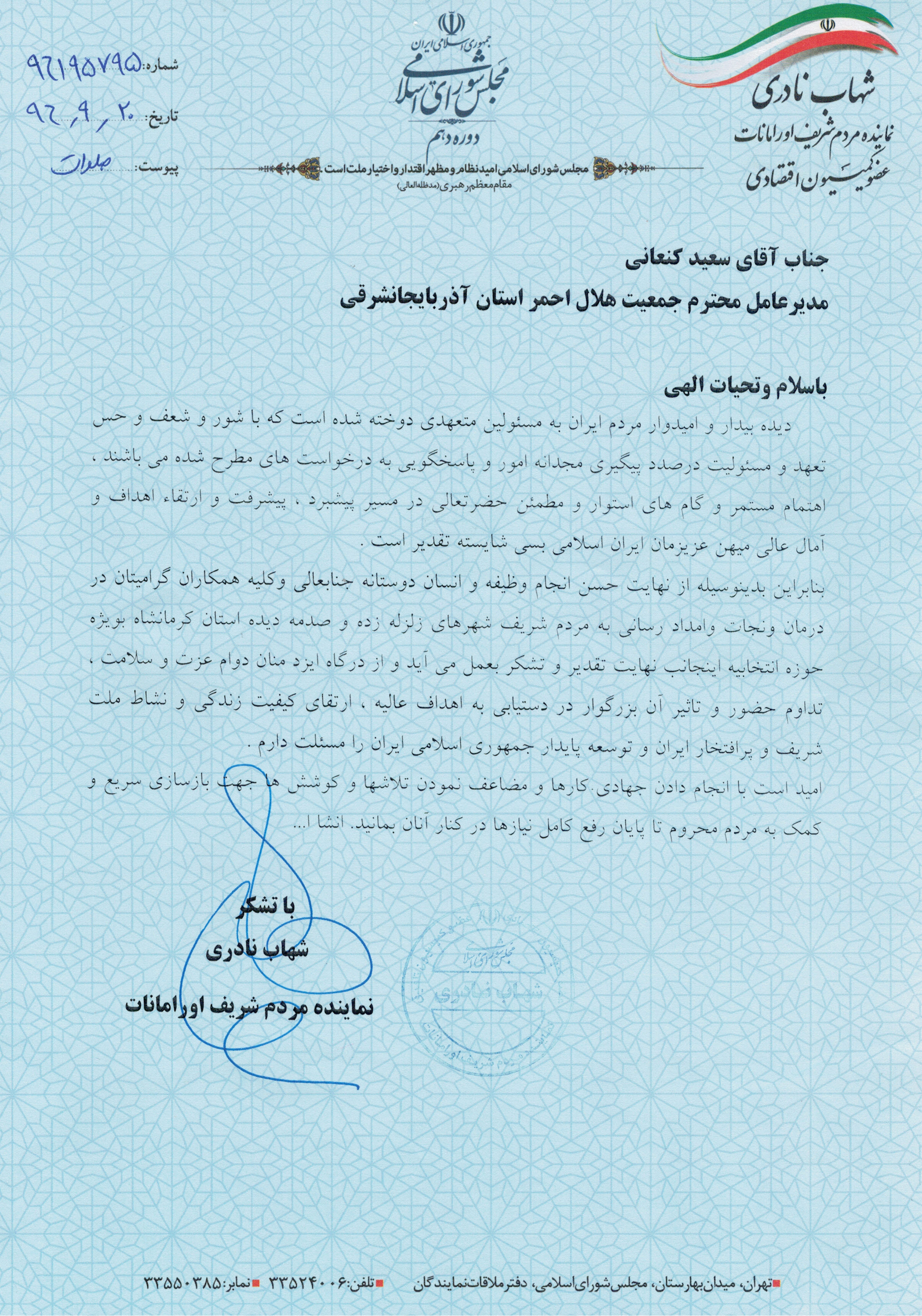 بنابراین بدینوسیله از نهایت حسن انجام وظیفه و انسان دوستانه جنابعالی و کلیه همکاران گرامیتان در درمان و نجات و امدادرسانی به مردم شریف شهرهای زلزله زده و صدمه دیده استان کرمانشاه بویژه حوزه انتخابیه اینجانب تقدیر و تشکر بعمل می آید و از درگاه ایزد منان دوام عزت و سلامت ،تداوم حضور و تاثیر آن بزرگوار در دستیابی به اهداف عالیه ،ارتقای کیفیت زندگی و نشاط ملت شریف و پر افتخار ایران و توسعه پایدار جمهوری اسلامی ایران را مسئلت دارم.