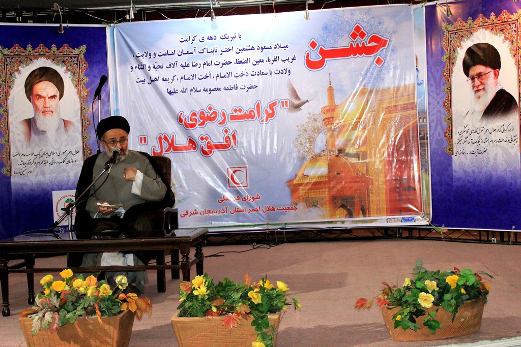 به گزارش روابط عمومی جمعیت هلال احمر استان آذربایجان شرقی ،در این جشن ،حجت الاسلام و المسلمین سید حمید میر باقری از اساتید بر جسته کشور طی سخنانی با گرامیداشت دهه کرامت  گفت : حضرت امام رضا (ع) می فرماید :شیعیان ما کسانی هستند که تسلیم امر و نهی ما باشند، گفتار ما را سرلوحه زندگی ـ در عمل و گفتار ـ خود قرار دهند، مخالف دشمنان ما باشند و هر که چنین نباشد از ما نیست.