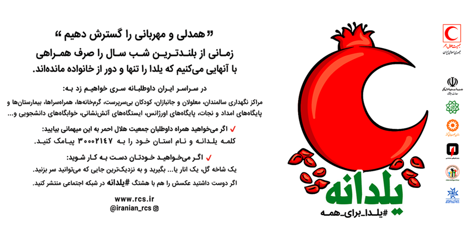 در سراسر ایران داوطلبانه سری خواهیم زد؛ به مراکز نگهداری سالمندان معلولان و جانبازان، کودکان بیسرپرست، گرمخانه ها ،همراه سراها، بیمارستان ها و پایگاه های امداد و نجات، پایگاههای اورژانس ،ایستگاههای آتشنشانی ،خوابگاه های دانشجویی و اگر می خواهید همراه داوطلبان جمعیت هلال احمر به این میهمانی بیاید کلمه یلدانه ونام استان خود را به 30002147 پیامک کنید، اگر می خواهید خودتان دست به کار شوید یک شاخه گل، یک انار یا ...بگیرید و به نزدیکترین جایی که میتوانید سر بزنید اگر دوست داشتید عکسش را با هشتگ #یلدانه در شبکه اجتماعی منتشر کنید