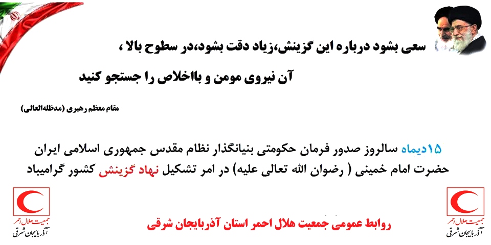 به گزارش روابط عمومی جمعیت هلال احمر استان آذربایجان شرقی ،صبح امروز یکشنبه ۱۶ دی ماه از مهدی پور اسماعیل نیازی مسئول گزینش جمعیت هلال احمر استان آذربایجان شرقی با اهدای لوح تقدیر به مناسبت ۱۵ دی ماه سالروز تشکیل گزینش به فرمان تاریخی حضرت امام خمینی ره تجلیل به عمل آمد.