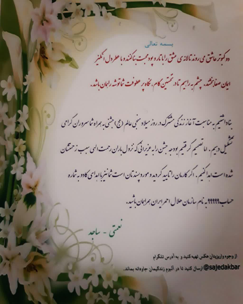 وظیفه خود دانستیم از ابتکار ارزشمندتان که در اقدامی بدیع و نو هزینه مراسم جشن عروسی خود را به سیل زدگان اختصاص داده و کارت عروسی ویژه ای برای این امر طراحی نمودید تقدیر و تشکر نماییم