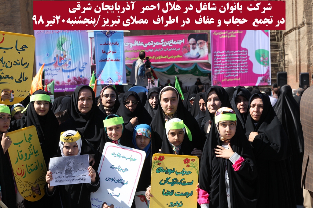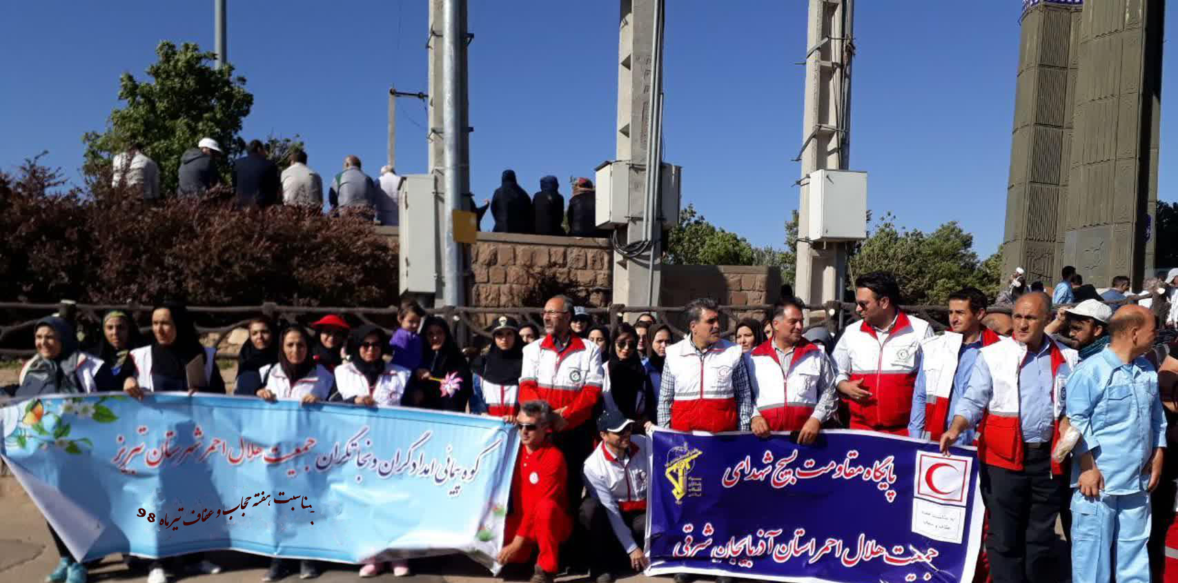 کارکنان شاغل در هلال احمر استان با حضور در تجمع بزرگ عفاف و حجاب در اطراف مصلای اعظم امام خمینی (ره) تبریز بر لزوم پاسداشت این میراث گرانبهای حضرت زهرا تاکید کردند همچنین بانوان عضو خانه داوطلبان جمعیت هلال احمر شهرستان تبریز بهمین مناسبت اقدام به کوهپیمایی کرده و مزار شهدای گمنام در عون بن علی را زیارت کرده و با آرمانهای شهدا و وصیت ایشان مبنی بر حفظ حجاب تجدید میثاق نمودند .