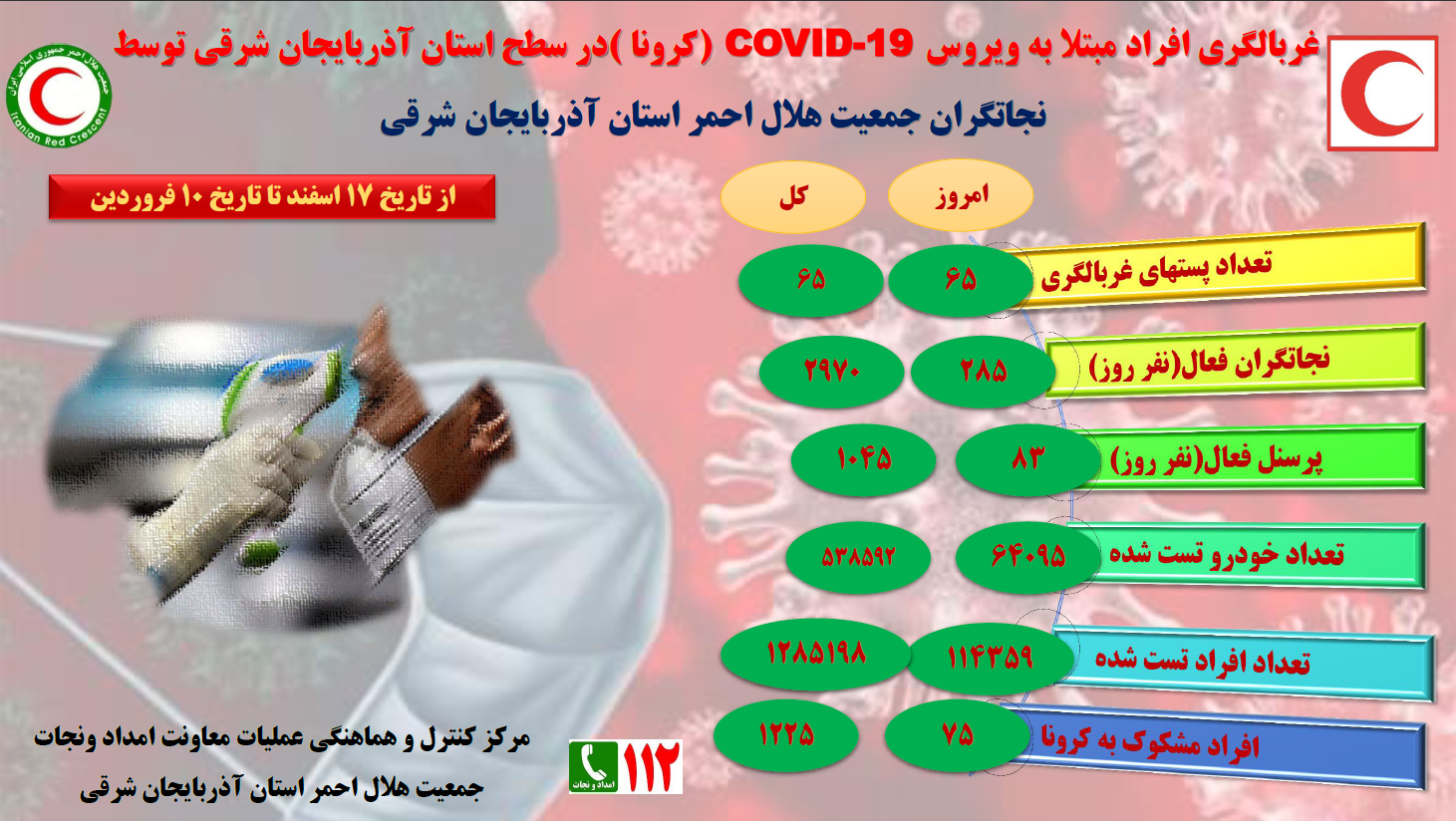 به گزارش روابط عمومی جمعیت هلال احمر استان آذربایجان شرقی، دکتر هادی موسوی گفت: تیم های غربالگری جمعیت هلال احمر استان آذربایجان شرقی در 65 نقطه استان در مبادی ورودی و خروجی استان و شهرها روزانه مشغول غربالگری و تب سنجی کرونا ویروس هستند و تاکنون از بدو شروع طرح غربالگری وپایش سلامت بیش از یک میلیون و دویست و هشتاد و پنج هزار نفر از سرنشینان 538 هزار دستگاه خودرو مورد تب سنجی کرونا ویروس تا پایان 10 فروردین 1399 قرار گرفته اند.