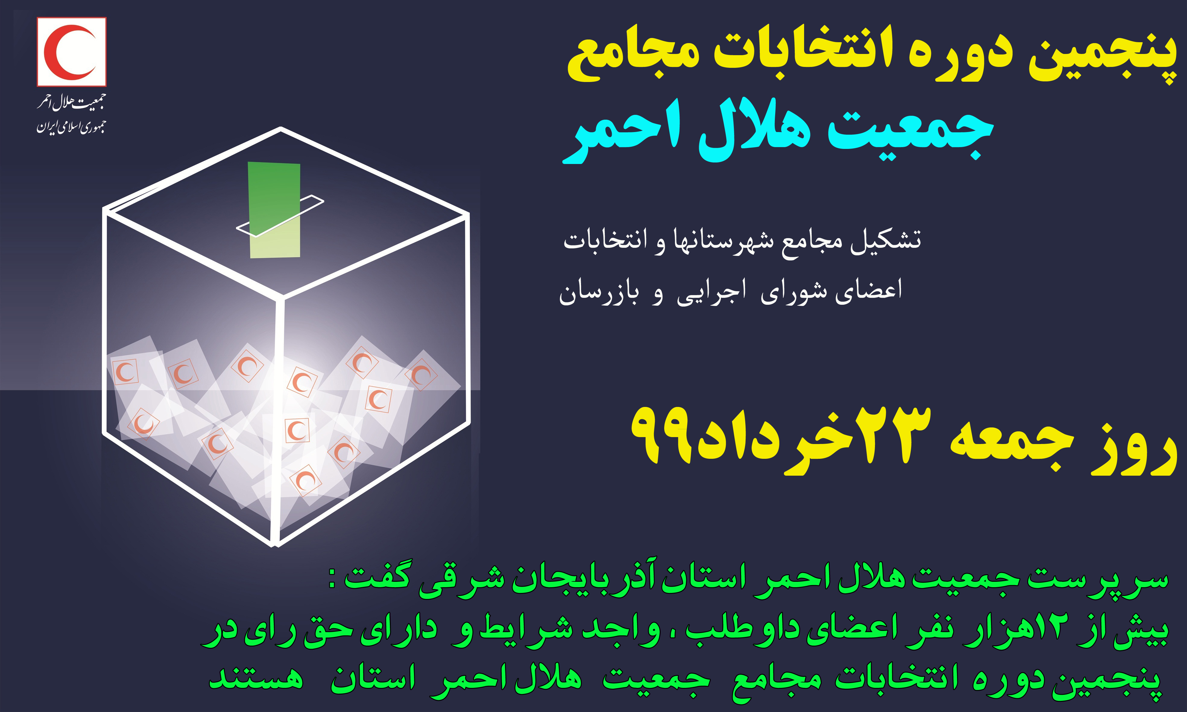 شایان ذکر است ، در روز جمعه ۲۳ خردادماه سال جاری، پنجمین دوره انتخابات مجامع جمعیت هلال احمر در 20 شهرستان استان آذربایجان شرقی برگزار خواهد شد.