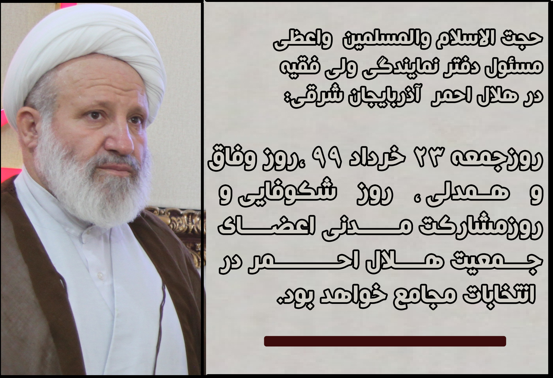 به گزارش روابط عمومی جمعیت هلال احمر استان آذربایجان شرقی، روز پنجشنبه 22خرداد 99، حجت الاسلام والمسلمین عبدالحمید واعظی در بازدید از ستاد اجرایی انتخابات مجمع شهر تبریز گفت :امروز توفیقی دست داد تا به همراهی مدیر عامل محترم جمعیت هلال احمر استان و معاونین از ستاد اجرایی پنجمین دوره انتخابات مجمع جمعیت هلال احمر شهرستان تبریز بازدید نماییم که جا دارد از کارکنان ،امدادگران، داوطلبان و عوامل اجرایی و عوامل نظارت وتمامی عزیزانی که در راستای برگزاری هرچه باشکوهتر پنجمین دوره انتخابات مجامع تلاش میکنند تقدیر و تشکر نماییم .