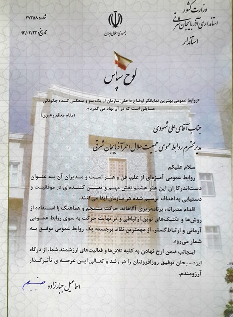 درهمایش مدیران روابط عمومی دستگاه‌های اجرایی و فرمانداری‌های تابعه استان آذربایجان شرقی دکترجبارزاده استاندار آذربایجان شرقی با اهدا لوح تقدیر از علی شهودی مدیر  روابط عمومی جمعیت هلال احمر استان اذربایجان شرقی بعنوان روابط عمومی برترتجلیل بعمل آورد.