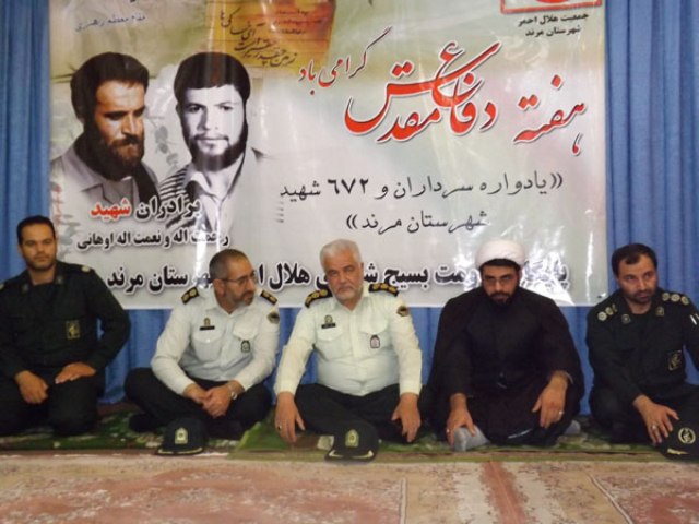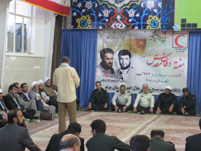 حبیب ذوالفقاری سرپرست جمعیت هلال احمرشهرستان مرند گفت: این مراسم همزمان با آخرین روز از هفته دفاع مقدس که به نام " عزت وپایداری، وحدت ملی ، استکبارستیزی" نامگذاری شده ، با حضور اقشار مختلف مردم و امت شهید پرور مرند در حسینیه حضرت امام خمینی(ره) مرندهمراه برگزار گردید.