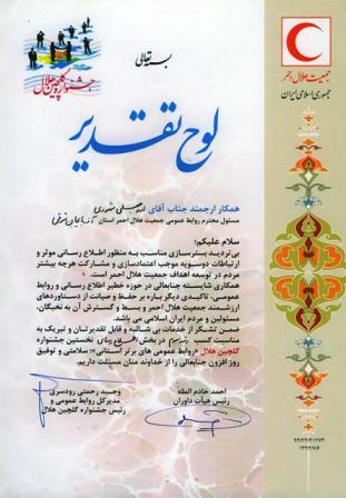 درنخستین جشنواره گلچین هلال (روابطعمومیهای برتر استانی) که با محوریت بررسی عملکردها در هفته هلالاحمر ۹۳، که درجمعیت هلالاحمر گیلان برگزارشداز روابط عمومی جمعیت هلال احمر آذربایجان شرقی تجلیل بعمل آمد.