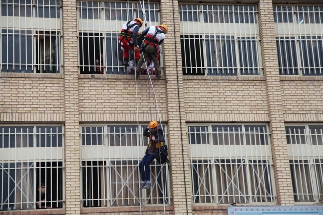 حسین پور افزود: اعضای تیم تخصصی امداد ونجات کوهستان در مانور پایلوت دبیرستان باهنر تبریزبا استفاده از دستگاههای برش پرتال سیار اقدام به برش نرده های پنجره  طبقه سوم دبیر ستان کرده و مصدومان فرضی  و شاگردان محبوس را از کلاسها نجات و با انجام راپل به محوطه و مکان امن  هدایت نمودند